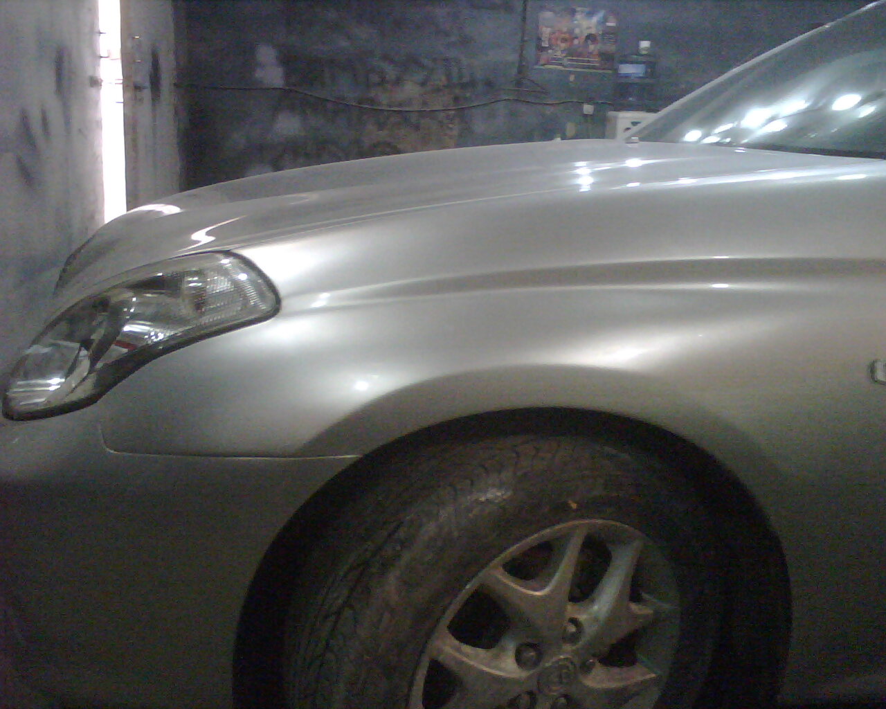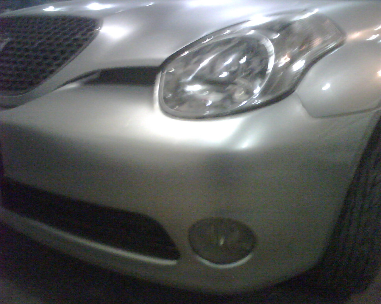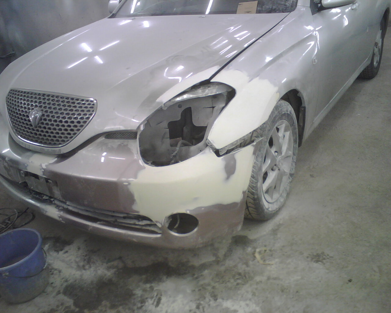 Дээр хэлсэнчлэн урд бампер нь сэргээн засах боломжгүй болсон байсан тул өөр нэгэн бамперын тасархайг олоод хуучин бампертай нь тааруулж наасан нь энэ.